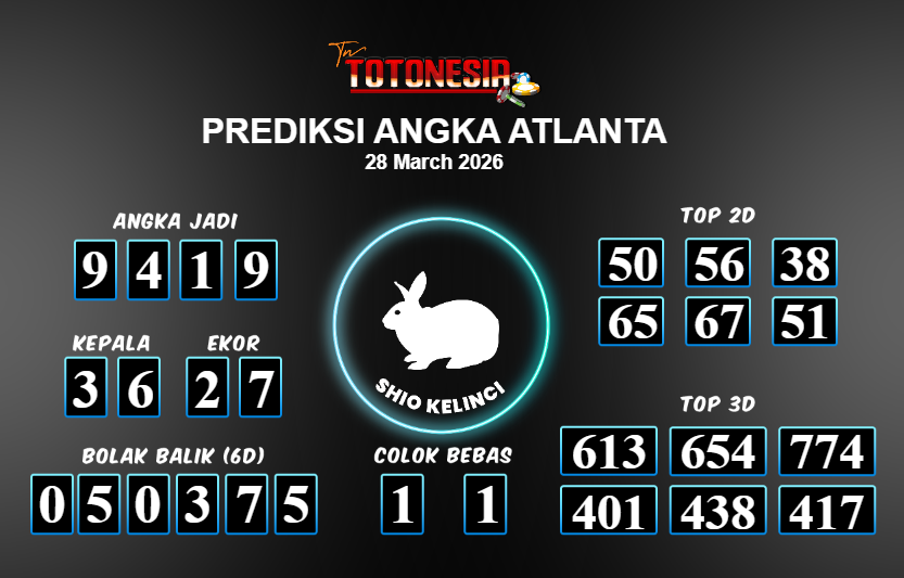Prediksi ATLANTA adalah perhitungan nomor togel unggulan dari agen suhu togel yang menyajikan angka prediksi paling akurat, sehingga memberikan banyak keuntungan saat bermain di pasar togel ATLANTA. TotoNesia adalah prediksi dengan rasio kemenangan tertinggi di Indonesia. Sebagai penyedia togel yang dapat dipercaya, kami bertekad untuk memberikan ramalan togel yang handal dengan hadiah terbesarnya. Maka dari itu, jangan sampai terlewatkan prediksi bandar togel dengan hadiah terbanyak bet 100 dari pasar togel terbaik ATLANTA Daftar sekarang juga di bandar.