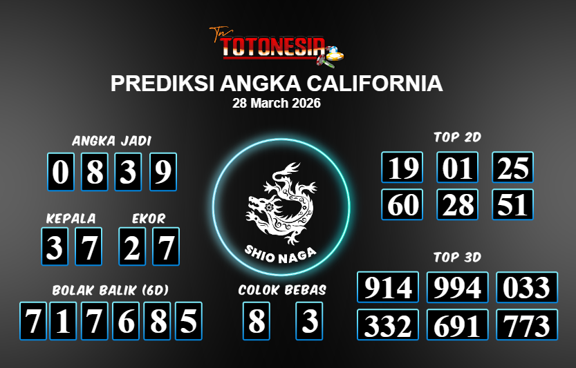 Toto Nesia : Bocoran Prediksi Togel CALIFORNIA Tanggal 28 MARET 2026