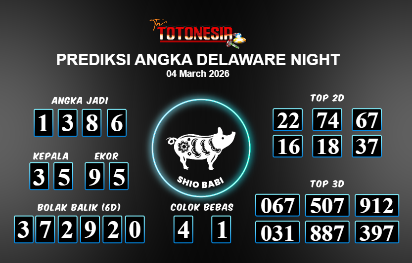 Prediksi DELAWARE NIGHT adalah perhitungan nomor togel unggulan dari agen suhu togel yang menyajikan angka prediksi paling akurat, sehingga memberikan banyak keuntungan saat bermain di pasar togel DELAWARE NIGHT . TotoNesia adalah prediksi dengan rasio kemenangan tertinggi di Indonesia. Sebagai penyedia togel yang dapat dipercaya, kami bertekad untuk memberikan ramalan togel yang handal dengan hadiah terbesarnya. Maka dari itu, jangan sampai terlewatkan prediksi bandar togel dengan hadiah terbanyak bet 100 dari pasar togel terbaik DELAWARE NIGHT Daftar sekarang juga di bandar.