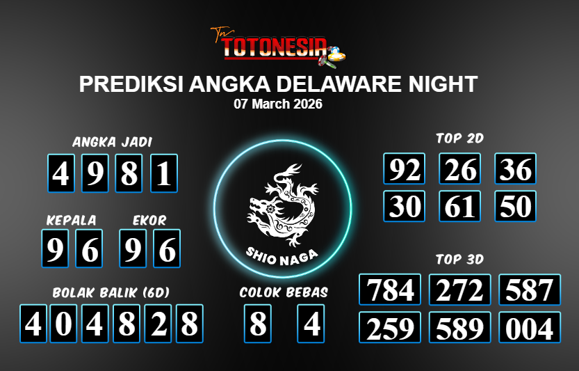 Prediksi DELAWARE NIGHT adalah perhitungan nomor togel unggulan dari agen suhu togel yang menyajikan angka prediksi paling akurat, sehingga memberikan banyak keuntungan saat bermain di pasar togel DELAWARE NIGHT . TotoNesia adalah prediksi dengan rasio kemenangan tertinggi di Indonesia. Sebagai penyedia togel yang dapat dipercaya, kami bertekad untuk memberikan ramalan togel yang handal dengan hadiah terbesarnya. Maka dari itu, jangan sampai terlewatkan prediksi bandar togel dengan hadiah terbanyak bet 100 dari pasar togel terbaik DELAWARE NIGHT Daftar sekarang juga di bandar.