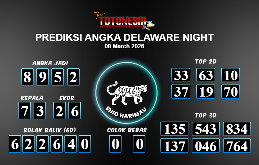 Prediksi DELAWARE NIGHT adalah perhitungan nomor togel unggulan dari agen suhu togel yang menyajikan angka prediksi paling akurat, sehingga memberikan banyak keuntungan saat bermain di pasar togel DELAWARE NIGHT . TotoNesia adalah prediksi dengan rasio kemenangan tertinggi di Indonesia. Sebagai penyedia togel yang dapat dipercaya, kami bertekad untuk memberikan ramalan togel yang handal dengan hadiah terbesarnya. Maka dari itu, jangan sampai terlewatkan prediksi bandar togel dengan hadiah terbanyak bet 100 dari pasar togel terbaik DELAWARE NIGHT Daftar sekarang juga di bandar.