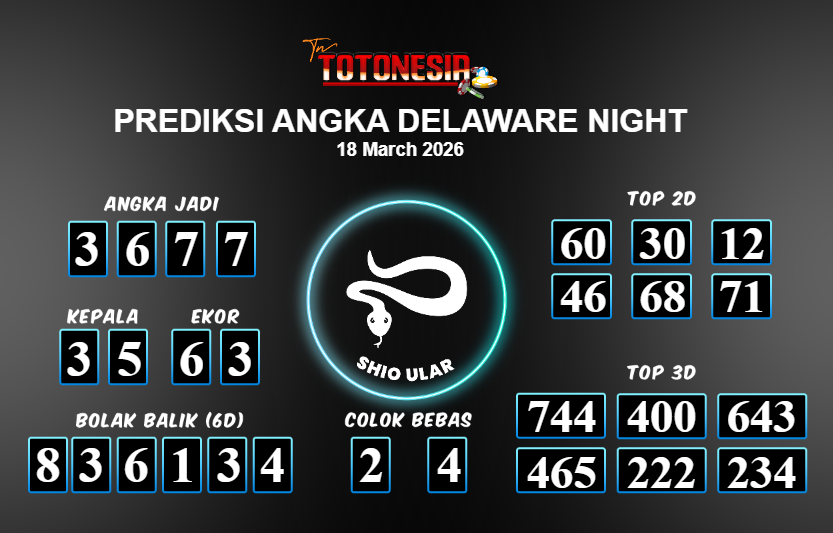 Prediksi DELAWARE NIGHT adalah perhitungan nomor togel unggulan dari agen suhu togel yang menyajikan angka prediksi paling akurat, sehingga memberikan banyak keuntungan saat bermain di pasar togel DELAWARE NIGHT . TotoNesia adalah prediksi dengan rasio kemenangan tertinggi di Indonesia. Sebagai penyedia togel yang dapat dipercaya, kami bertekad untuk memberikan ramalan togel yang handal dengan hadiah terbesarnya. Maka dari itu, jangan sampai terlewatkan prediksi bandar togel dengan hadiah terbanyak bet 100 dari pasar togel terbaik DELAWARE NIGHT Daftar sekarang juga di bandar.