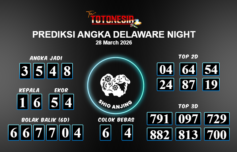 Prediksi DELAWARE NIGHT adalah perhitungan nomor togel unggulan dari agen suhu togel yang menyajikan angka prediksi paling akurat, sehingga memberikan banyak keuntungan saat bermain di pasar togel DELAWARE NIGHT . TotoNesia adalah prediksi dengan rasio kemenangan tertinggi di Indonesia. Sebagai penyedia togel yang dapat dipercaya, kami bertekad untuk memberikan ramalan togel yang handal dengan hadiah terbesarnya. Maka dari itu, jangan sampai terlewatkan prediksi bandar togel dengan hadiah terbanyak bet 100 dari pasar togel terbaik DELAWARE NIGHT Daftar sekarang juga di bandar.