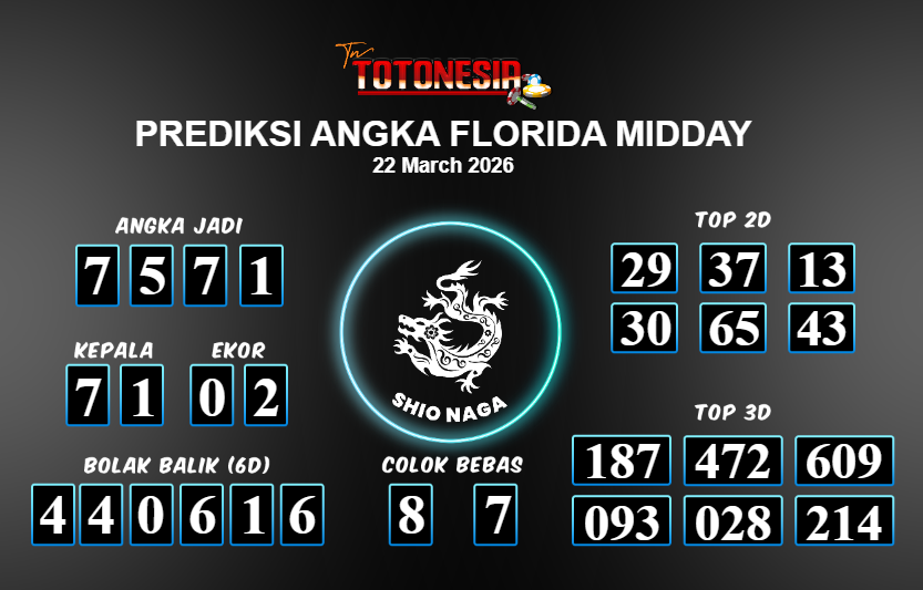 Prediksi FLORIDA MIDDAY adalah perhitungan nomor togel unggulan dari agen suhu togel yang menyajikan angka prediksi paling akurat, sehingga memberikan banyak keuntungan saat bermain di pasar togel FLORIDA MIDDAY . TotoNesia adalah prediksi dengan rasio kemenangan tertinggi di Indonesia. Sebagai penyedia togel yang dapat dipercaya, kami bertekad untuk memberikan ramalan togel yang handal dengan hadiah terbesarnya. Maka dari itu, jangan sampai terlewatkan prediksi bandar togel dengan hadiah terbanyak bet 100 dari pasar togel terbaik FLORIDA MIDDAY Daftar sekarang juga di bandar.
