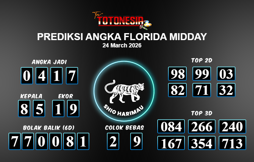 Prediksi FLORIDA MIDDAY adalah perhitungan nomor togel unggulan dari agen suhu togel yang menyajikan angka prediksi paling akurat, sehingga memberikan banyak keuntungan saat bermain di pasar togel FLORIDA MIDDAY . TotoNesia adalah prediksi dengan rasio kemenangan tertinggi di Indonesia. Sebagai penyedia togel yang dapat dipercaya, kami bertekad untuk memberikan ramalan togel yang handal dengan hadiah terbesarnya. Maka dari itu, jangan sampai terlewatkan prediksi bandar togel dengan hadiah terbanyak bet 100 dari pasar togel terbaik FLORIDA MIDDAY Daftar sekarang juga di bandar.
