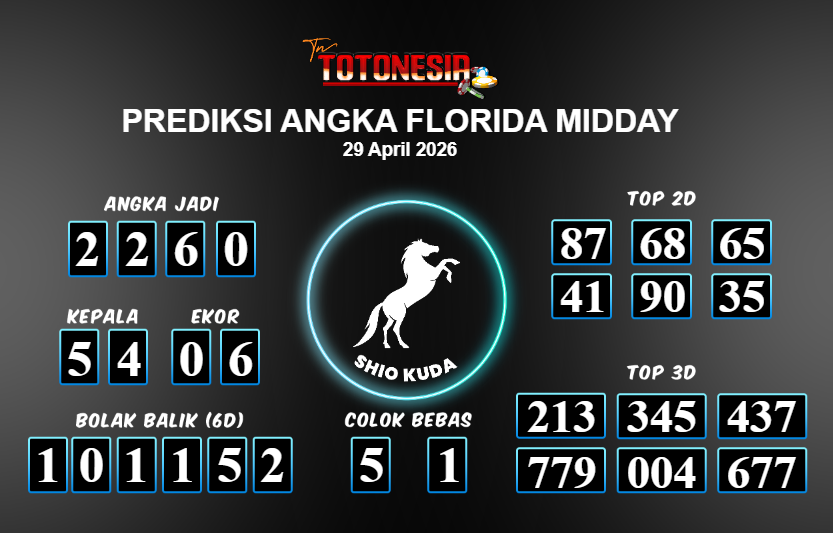 Prediksi FLORIDA MIDDAY adalah perhitungan nomor togel unggulan dari agen suhu togel yang menyajikan angka prediksi paling akurat, sehingga memberikan banyak keuntungan saat bermain di pasar togel FLORIDA MIDDAY . TotoNesia adalah prediksi dengan rasio kemenangan tertinggi di Indonesia. Sebagai penyedia togel yang dapat dipercaya, kami bertekad untuk memberikan ramalan togel yang handal dengan hadiah terbesarnya. Maka dari itu, jangan sampai terlewatkan prediksi bandar togel dengan hadiah terbanyak bet 100 dari pasar togel terbaik FLORIDA MIDDAY Daftar sekarang juga di bandar.