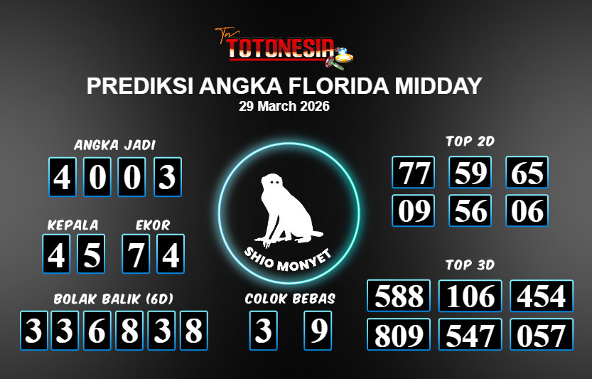 Prediksi FLORIDA MIDDAY adalah perhitungan nomor togel unggulan dari agen suhu togel yang menyajikan angka prediksi paling akurat, sehingga memberikan banyak keuntungan saat bermain di pasar togel FLORIDA MIDDAY . TotoNesia adalah prediksi dengan rasio kemenangan tertinggi di Indonesia. Sebagai penyedia togel yang dapat dipercaya, kami bertekad untuk memberikan ramalan togel yang handal dengan hadiah terbesarnya. Maka dari itu, jangan sampai terlewatkan prediksi bandar togel dengan hadiah terbanyak bet 100 dari pasar togel terbaik FLORIDA MIDDAY Daftar sekarang juga di bandar.