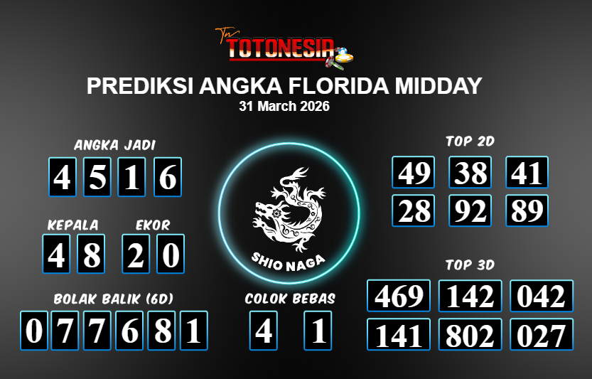 Prediksi FLORIDA MIDDAY adalah perhitungan nomor togel unggulan dari agen suhu togel yang menyajikan angka prediksi paling akurat, sehingga memberikan banyak keuntungan saat bermain di pasar togel FLORIDA MIDDAY . TotoNesia adalah prediksi dengan rasio kemenangan tertinggi di Indonesia. Sebagai penyedia togel yang dapat dipercaya, kami bertekad untuk memberikan ramalan togel yang handal dengan hadiah terbesarnya. Maka dari itu, jangan sampai terlewatkan prediksi bandar togel dengan hadiah terbanyak bet 100 dari pasar togel terbaik FLORIDA MIDDAY Daftar sekarang juga di bandar.