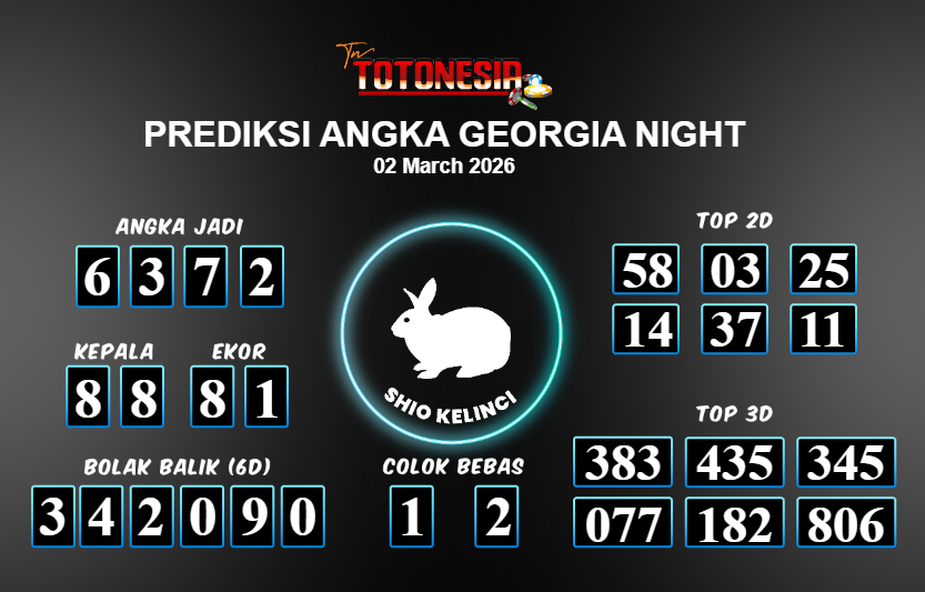 Toto Nesia : Bocoran Prediksi Togel GEORGIA NIGHT Tanggal 02 MARET 2026