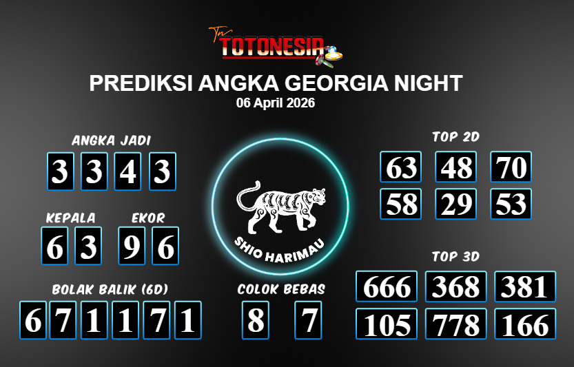 Prediksi GEORGIA NIGHT adalah perhitungan nomor togel unggulan dari agen suhu togel yang menyajikan angka prediksi paling akurat, sehingga memberikan banyak keuntungan saat bermain di pasar togel GEORGIA NIGHT . TotoNesia adalah prediksi dengan rasio kemenangan tertinggi di Indonesia. Sebagai penyedia togel yang dapat dipercaya, kami bertekad untuk memberikan ramalan togel yang handal dengan hadiah terbesarnya. Maka dari itu, jangan sampai terlewatkan prediksi bandar togel dengan hadiah terbanyak bet 100 dari pasar togel terbaik GEORGIA NIGHT Daftar sekarang juga di bandar.