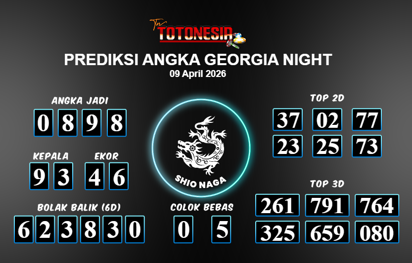 Prediksi GEORGIA NIGHT adalah perhitungan nomor togel unggulan dari agen suhu togel yang menyajikan angka prediksi paling akurat, sehingga memberikan banyak keuntungan saat bermain di pasar togel GEORGIA NIGHT . TotoNesia adalah prediksi dengan rasio kemenangan tertinggi di Indonesia. Sebagai penyedia togel yang dapat dipercaya, kami bertekad untuk memberikan ramalan togel yang handal dengan hadiah terbesarnya. Maka dari itu, jangan sampai terlewatkan prediksi bandar togel dengan hadiah terbanyak bet 100 dari pasar togel terbaik GEORGIA NIGHT Daftar sekarang juga di bandar.