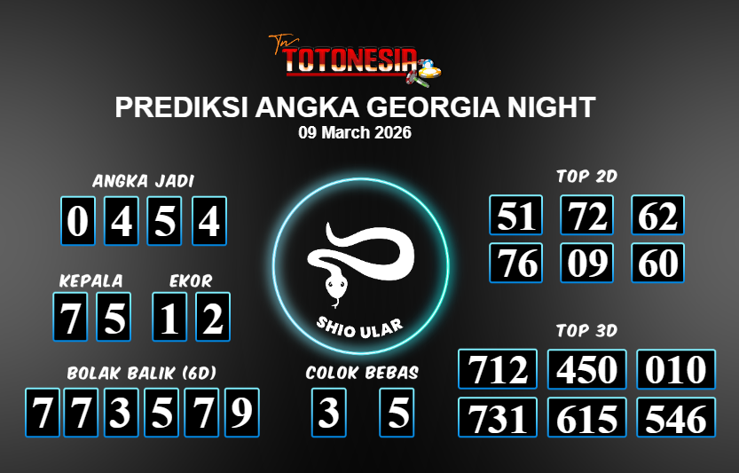 Toto Nesia : Bocoran Prediksi Togel GEORGIA NIGHT Tanggal 09 MARET 2026