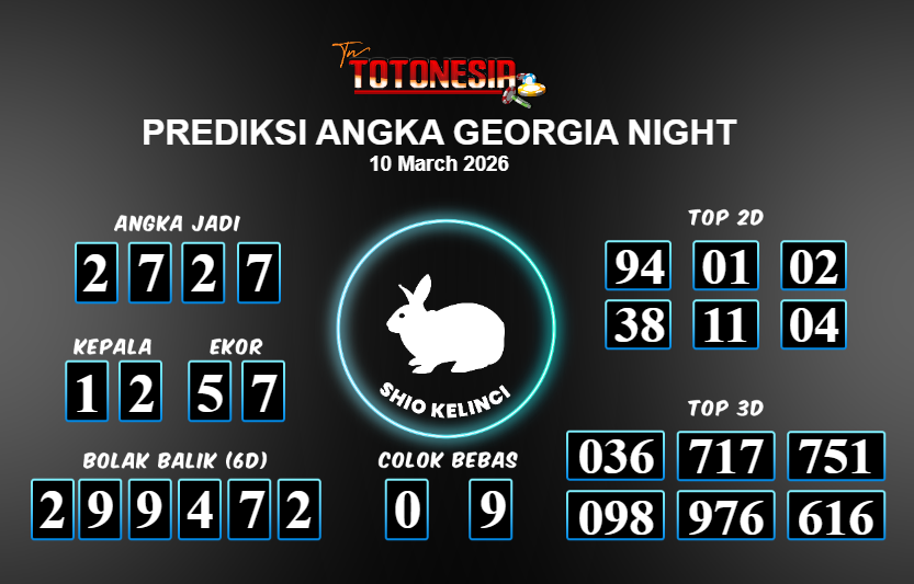 Prediksi GEORGIA NIGHT adalah perhitungan nomor togel unggulan dari agen suhu togel yang menyajikan angka prediksi paling akurat, sehingga memberikan banyak keuntungan saat bermain di pasar togel GEORGIA NIGHT . TotoNesia adalah prediksi dengan rasio kemenangan tertinggi di Indonesia. Sebagai penyedia togel yang dapat dipercaya, kami bertekad untuk memberikan ramalan togel yang handal dengan hadiah terbesarnya. Maka dari itu, jangan sampai terlewatkan prediksi bandar togel dengan hadiah terbanyak bet 100 dari pasar togel terbaik GEORGIA NIGHT Daftar sekarang juga di bandar.