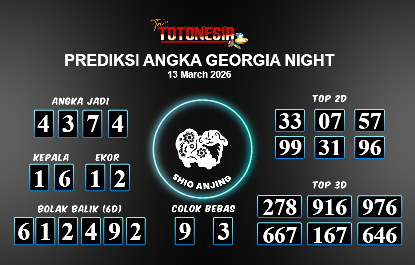 Prediksi GEORGIA NIGHT adalah perhitungan nomor togel unggulan dari agen suhu togel yang menyajikan angka prediksi paling akurat, sehingga memberikan banyak keuntungan saat bermain di pasar togel GEORGIA NIGHT . TotoNesia adalah prediksi dengan rasio kemenangan tertinggi di Indonesia. Sebagai penyedia togel yang dapat dipercaya, kami bertekad untuk memberikan ramalan togel yang handal dengan hadiah terbesarnya. Maka dari itu, jangan sampai terlewatkan prediksi bandar togel dengan hadiah terbanyak bet 100 dari pasar togel terbaik GEORGIA NIGHT Daftar sekarang juga di bandar.
