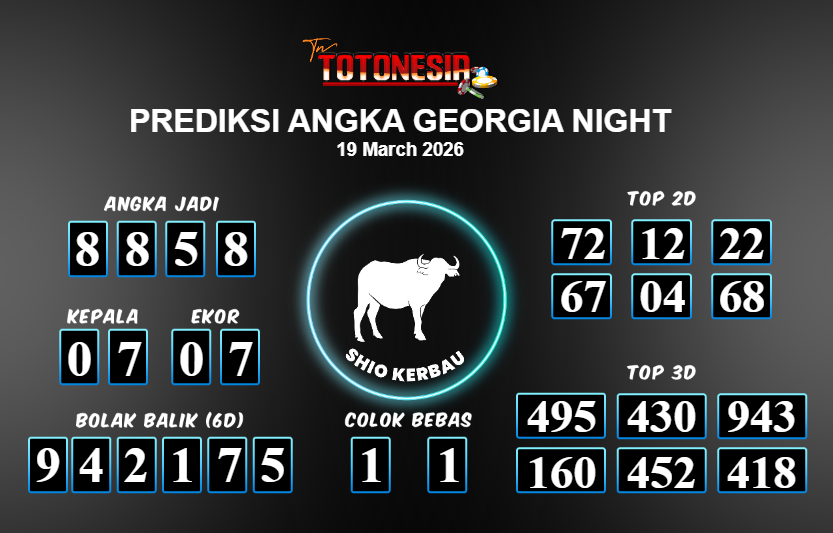 Prediksi GEORGIA NIGHT adalah perhitungan nomor togel unggulan dari agen suhu togel yang menyajikan angka prediksi paling akurat, sehingga memberikan banyak keuntungan saat bermain di pasar togel GEORGIA NIGHT . TotoNesia adalah prediksi dengan rasio kemenangan tertinggi di Indonesia. Sebagai penyedia togel yang dapat dipercaya, kami bertekad untuk memberikan ramalan togel yang handal dengan hadiah terbesarnya. Maka dari itu, jangan sampai terlewatkan prediksi bandar togel dengan hadiah terbanyak bet 100 dari pasar togel terbaik GEORGIA NIGHT Daftar sekarang juga di bandar.