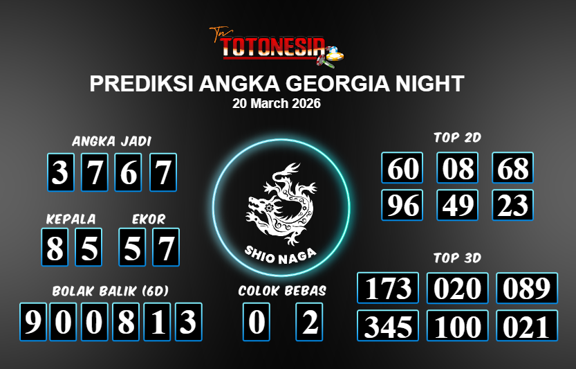 Prediksi GEORGIA NIGHT adalah perhitungan nomor togel unggulan dari agen suhu togel yang menyajikan angka prediksi paling akurat, sehingga memberikan banyak keuntungan saat bermain di pasar togel GEORGIA NIGHT . TotoNesia adalah prediksi dengan rasio kemenangan tertinggi di Indonesia. Sebagai penyedia togel yang dapat dipercaya, kami bertekad untuk memberikan ramalan togel yang handal dengan hadiah terbesarnya. Maka dari itu, jangan sampai terlewatkan prediksi bandar togel dengan hadiah terbanyak bet 100 dari pasar togel terbaik GEORGIA NIGHT Daftar sekarang juga di bandar.