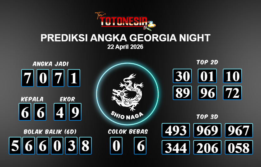 Prediksi GEORGIA NIGHT adalah perhitungan nomor togel unggulan dari agen suhu togel yang menyajikan angka prediksi paling akurat, sehingga memberikan banyak keuntungan saat bermain di pasar togel GEORGIA NIGHT . TotoNesia adalah prediksi dengan rasio kemenangan tertinggi di Indonesia. Sebagai penyedia togel yang dapat dipercaya, kami bertekad untuk memberikan ramalan togel yang handal dengan hadiah terbesarnya. Maka dari itu, jangan sampai terlewatkan prediksi bandar togel dengan hadiah terbanyak bet 100 dari pasar togel terbaik GEORGIA NIGHT Daftar sekarang juga di bandar.