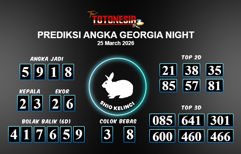 Prediksi GEORGIA NIGHT adalah perhitungan nomor togel unggulan dari agen suhu togel yang menyajikan angka prediksi paling akurat, sehingga memberikan banyak keuntungan saat bermain di pasar togel GEORGIA NIGHT . TotoNesia adalah prediksi dengan rasio kemenangan tertinggi di Indonesia. Sebagai penyedia togel yang dapat dipercaya, kami bertekad untuk memberikan ramalan togel yang handal dengan hadiah terbesarnya. Maka dari itu, jangan sampai terlewatkan prediksi bandar togel dengan hadiah terbanyak bet 100 dari pasar togel terbaik GEORGIA NIGHT Daftar sekarang juga di bandar.
