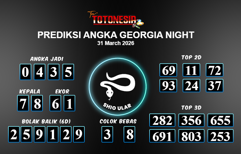 Prediksi GEORGIA NIGHT adalah perhitungan nomor togel unggulan dari agen suhu togel yang menyajikan angka prediksi paling akurat, sehingga memberikan banyak keuntungan saat bermain di pasar togel GEORGIA NIGHT . TotoNesia adalah prediksi dengan rasio kemenangan tertinggi di Indonesia. Sebagai penyedia togel yang dapat dipercaya, kami bertekad untuk memberikan ramalan togel yang handal dengan hadiah terbesarnya. Maka dari itu, jangan sampai terlewatkan prediksi bandar togel dengan hadiah terbanyak bet 100 dari pasar togel terbaik GEORGIA NIGHT Daftar sekarang juga di bandar.