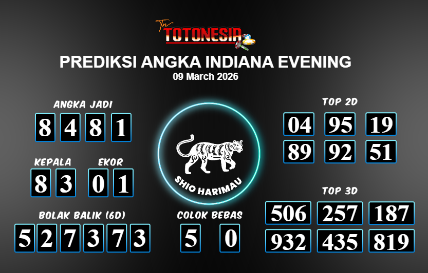 Toto Nesia : Bocoran Prediksi Togel INDIANA EVENING Tanggal 09 MARET 2026