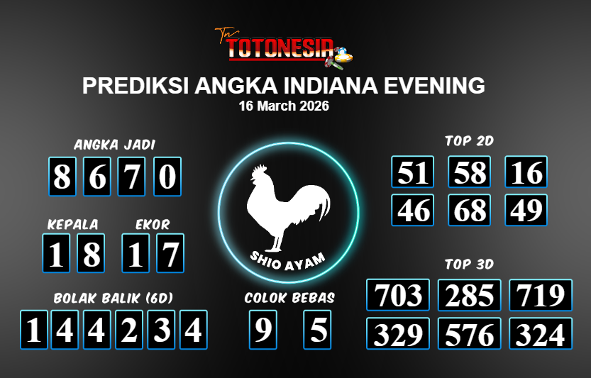 Toto Nesia : Bocoran Prediksi Togel INDIANA EVENING Tanggal 16 MARET 2026