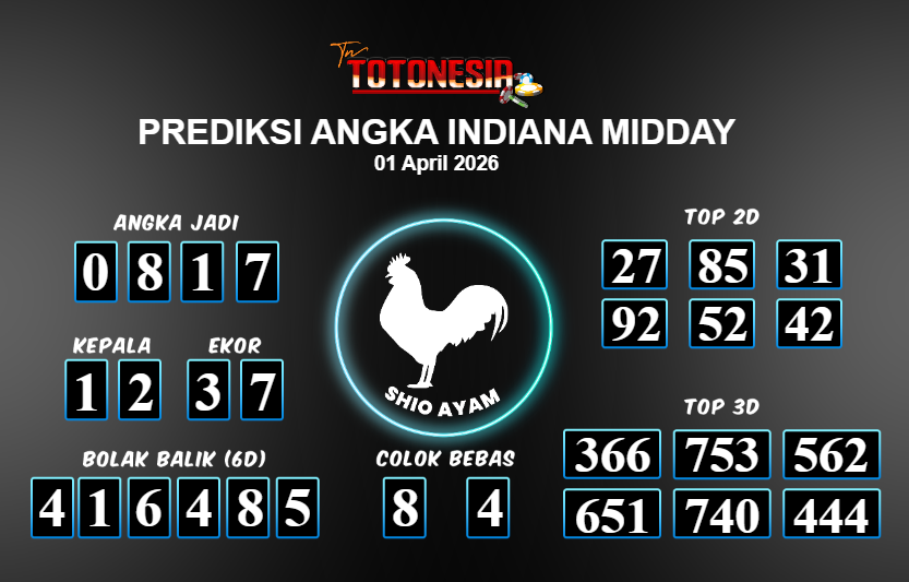 Toto Nesia : Bocoran Prediksi Togel INDIANA MIDDAY Tanggal 01 APRIL 2026