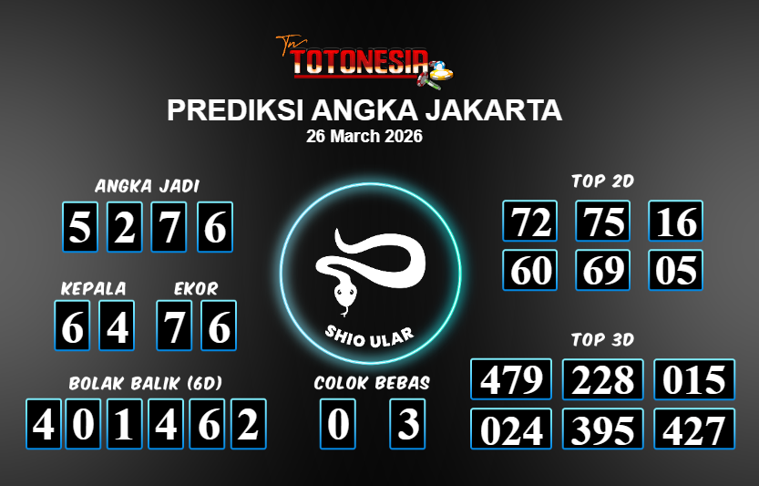 Prediksi JAKARTA adalah perhitungan nomor togel unggulan dari agen suhu togel yang menyajikan angka prediksi paling akurat, sehingga memberikan banyak keuntungan saat bermain di pasar togel JAKARTA . TotoNesia adalah prediksi dengan rasio kemenangan tertinggi di Indonesia. Sebagai penyedia togel yang dapat dipercaya, kami bertekad untuk memberikan ramalan togel yang handal dengan hadiah terbesarnya. Maka dari itu, jangan sampai terlewatkan prediksi bandar togel dengan hadiah terbanyak bet 100 dari pasar togel terbaik JAKARTA Daftar sekarang juga di bandar.