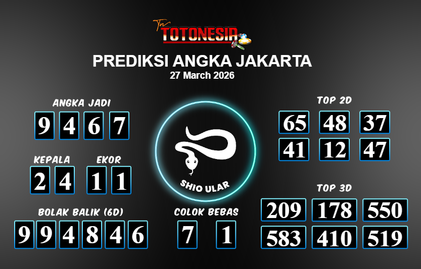 Prediksi JAKARTA adalah perhitungan nomor togel unggulan dari agen suhu togel yang menyajikan angka prediksi paling akurat, sehingga memberikan banyak keuntungan saat bermain di pasar togel JAKARTA . TotoNesia adalah prediksi dengan rasio kemenangan tertinggi di Indonesia. Sebagai penyedia togel yang dapat dipercaya, kami bertekad untuk memberikan ramalan togel yang handal dengan hadiah terbesarnya. Maka dari itu, jangan sampai terlewatkan prediksi bandar togel dengan hadiah terbanyak bet 100 dari pasar togel terbaik JAKARTA Daftar sekarang juga di bandar.