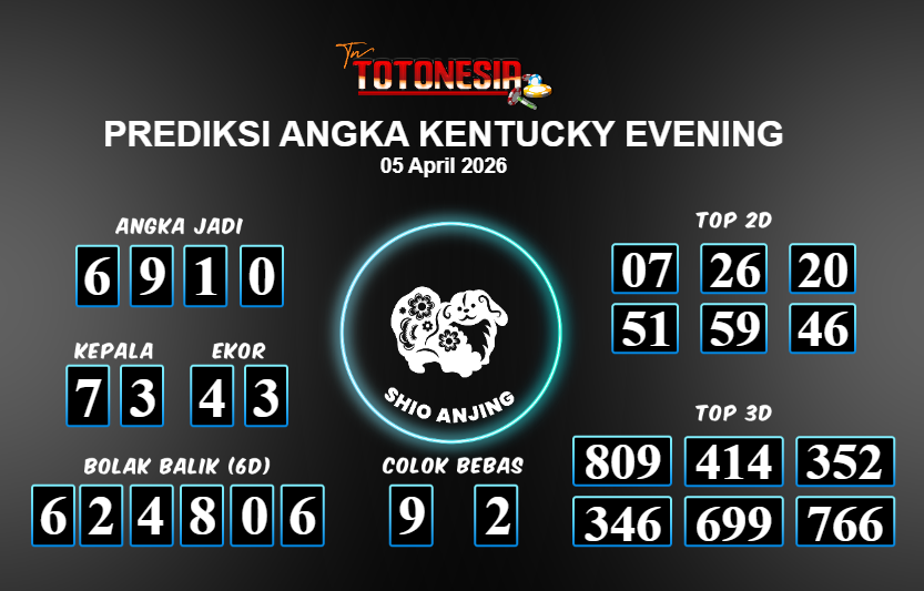 Prediksi KENTUCKY EVENING adalah perhitungan nomor togel unggulan dari agen suhu togel yang menyajikan angka prediksi paling akurat, sehingga memberikan banyak keuntungan saat bermain di pasar togel KENTUCKY EVENING . TotoNesia adalah prediksi dengan rasio kemenangan tertinggi di Indonesia. Sebagai penyedia togel yang dapat dipercaya, kami bertekad untuk memberikan ramalan togel yang handal dengan hadiah terbesarnya. Maka dari itu, jangan sampai terlewatkan prediksi bandar togel dengan hadiah terbanyak bet 100 dari pasar togel terbaik KENTUCKY EVENING Daftar sekarang juga di bandar.