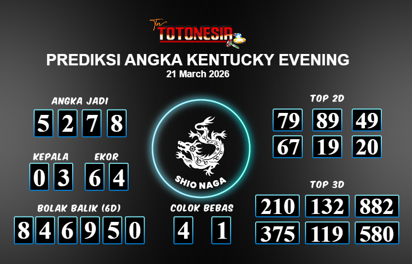 Prediksi KENTUCKY EVENING adalah perhitungan nomor togel unggulan dari agen suhu togel yang menyajikan angka prediksi paling akurat, sehingga memberikan banyak keuntungan saat bermain di pasar togel KENTUCKY EVENING. TotoNesia adalah prediksi dengan rasio kemenangan tertinggi di Indonesia. Sebagai penyedia togel yang dapat dipercaya, kami bertekad untuk memberikan ramalan togel yang handal dengan hadiah terbesarnya. Maka dari itu, jangan sampai terlewatkan prediksi bandar togel dengan hadiah terbanyak bet 100 dari pasar togel terbaik KENTUCKY EVENING Daftar sekarang juga di bandar.