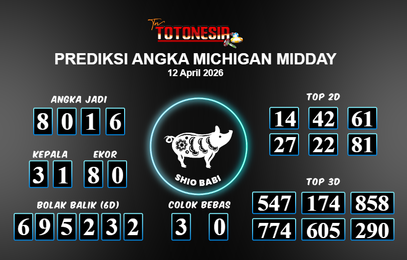 Prediksi MICHIGAN MIDDAY adalah perhitungan nomor togel unggulan dari agen suhu togel yang menyajikan angka prediksi paling akurat, sehingga memberikan banyak keuntungan saat bermain di pasar togel MICHIGAN MIDDAY. TotoNesia adalah prediksi dengan rasio kemenangan tertinggi di Indonesia. Sebagai penyedia togel yang dapat dipercaya, kami bertekad untuk memberikan ramalan togel yang handal dengan hadiah terbesarnya. Maka dari itu, jangan sampai terlewatkan prediksi bandar togel dengan hadiah terbanyak bet 100 dari pasar togel terbaik MICHIGAN MIDDAY Daftar sekarang juga di bandar.