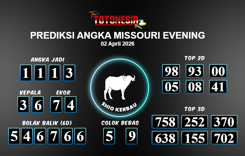 Prediksi MISSOURI EVENING adalah perhitungan nomor togel unggulan dari agen suhu togel yang menyajikan angka prediksi paling akurat, sehingga memberikan banyak keuntungan saat bermain di pasar togel MISSOURI EVENING. TotoNesia adalah prediksi dengan rasio kemenangan tertinggi di Indonesia. Sebagai penyedia togel yang dapat dipercaya, kami bertekad untuk memberikan ramalan togel yang handal dengan hadiah terbesarnya. Maka dari itu, jangan sampai terlewatkan prediksi bandar togel dengan hadiah terbanyak bet 100 dari pasar togel terbaik MISSOURI EVENING Daftar sekarang juga di bandar.