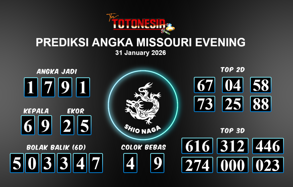 Prediksi MISSOURI EVENING adalah perhitungan nomor togel unggulan dari agen suhu togel yang menyajikan angka prediksi paling akurat, sehingga memberikan banyak keuntungan saat bermain di pasar togel MISSOURI EVENING. TotoNesia adalah prediksi dengan rasio kemenangan tertinggi di Indonesia. Sebagai penyedia togel yang dapat dipercaya, kami bertekad untuk memberikan ramalan togel yang handal dengan hadiah terbesarnya. Maka dari itu, jangan sampai terlewatkan prediksi bandar togel dengan hadiah terbanyak bet 100 dari pasar togel terbaik MISSOURI EVENING Daftar sekarang juga di bandar.