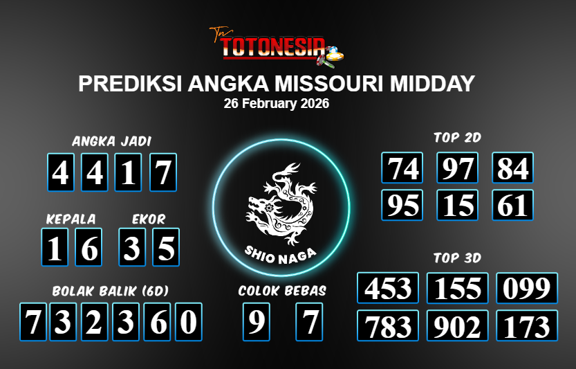 Toto Nesia : Bocoran Prediksi Togel MISSOURI MIDDAY Tanggal 26 FEBUARI 2026