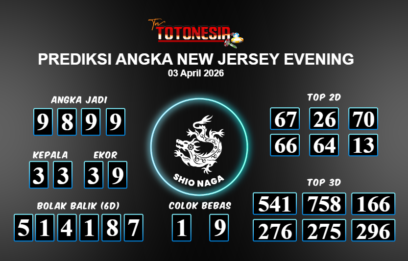Prediksi NEW JERSEY EVENING adalah perhitungan nomor togel unggulan dari agen suhu togel yang menyajikan angka prediksi paling akurat, sehingga memberikan banyak keuntungan saat bermain di pasar togel NEW JERSEY EVENING . TotoNesia adalah prediksi dengan rasio kemenangan tertinggi di Indonesia. Sebagai penyedia togel yang dapat dipercaya, kami bertekad untuk memberikan ramalan togel yang handal dengan hadiah terbesarnya. Maka dari itu, jangan sampai terlewatkan prediksi bandar togel dengan hadiah terbanyak bet 100 dari pasar togel terbaik NEW JERSEY EVENING Daftar sekarang juga di bandar.