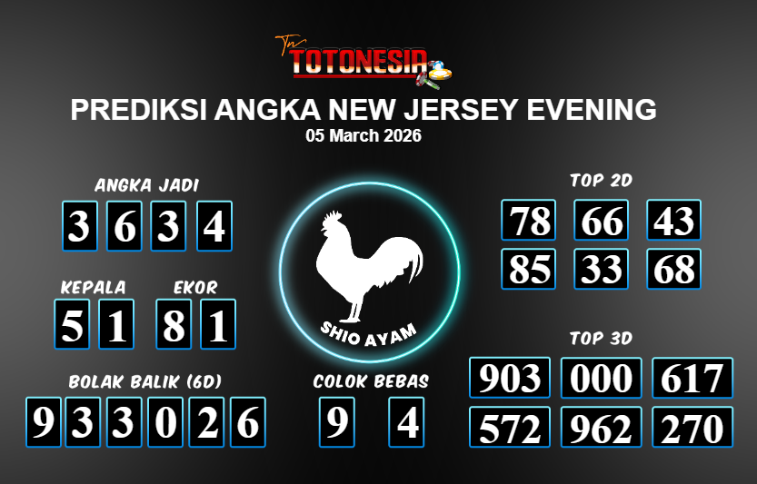 Prediksi NEW JERSEY EVENING adalah perhitungan nomor togel unggulan dari agen suhu togel yang menyajikan angka prediksi paling akurat, sehingga memberikan banyak keuntungan saat bermain di pasar togel NEW JERSEY EVENING . TotoNesia adalah prediksi dengan rasio kemenangan tertinggi di Indonesia. Sebagai penyedia togel yang dapat dipercaya, kami bertekad untuk memberikan ramalan togel yang handal dengan hadiah terbesarnya. Maka dari itu, jangan sampai terlewatkan prediksi bandar togel dengan hadiah terbanyak bet 100 dari pasar togel terbaik NEW JERSEY EVENING Daftar sekarang juga di bandar.