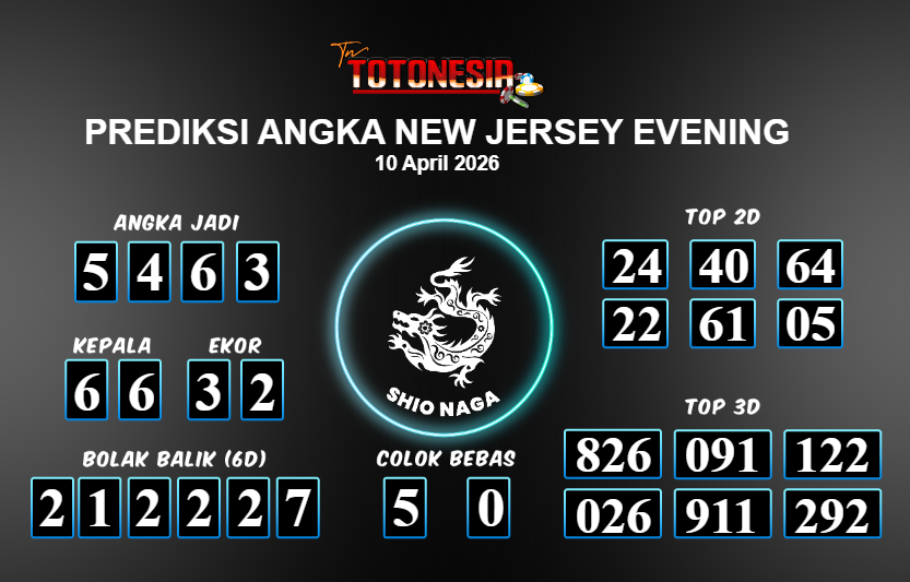 Prediksi NEW JERSEY EVENING adalah perhitungan nomor togel unggulan dari agen suhu togel yang menyajikan angka prediksi paling akurat, sehingga memberikan banyak keuntungan saat bermain di pasar togel NEW JERSEY EVENING . TotoNesia adalah prediksi dengan rasio kemenangan tertinggi di Indonesia. Sebagai penyedia togel yang dapat dipercaya, kami bertekad untuk memberikan ramalan togel yang handal dengan hadiah terbesarnya. Maka dari itu, jangan sampai terlewatkan prediksi bandar togel dengan hadiah terbanyak bet 100 dari pasar togel terbaik NEW JERSEY EVENING Daftar sekarang juga di bandar.