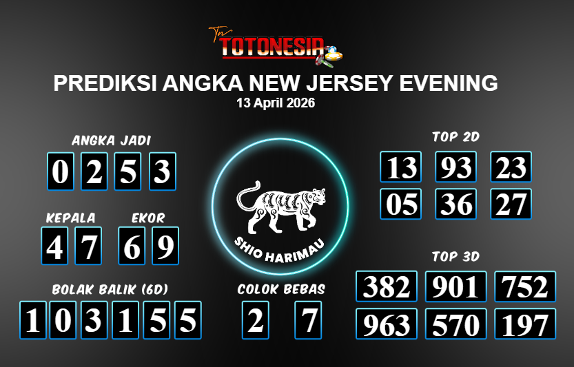 Prediksi NEW JERSEY EVENING adalah perhitungan nomor togel unggulan dari agen suhu togel yang menyajikan angka prediksi paling akurat, sehingga memberikan banyak keuntungan saat bermain di pasar togel NEW JERSEY EVENING. TotoNesia adalah prediksi dengan rasio kemenangan tertinggi di Indonesia. Sebagai penyedia togel yang dapat dipercaya, kami bertekad untuk memberikan ramalan togel yang handal dengan hadiah terbesarnya. Maka dari itu, jangan sampai terlewatkan prediksi bandar togel dengan hadiah terbanyak bet 100 dari pasar togel terbaik NEW JERSEY EVENING Daftar sekarang juga di bandar.