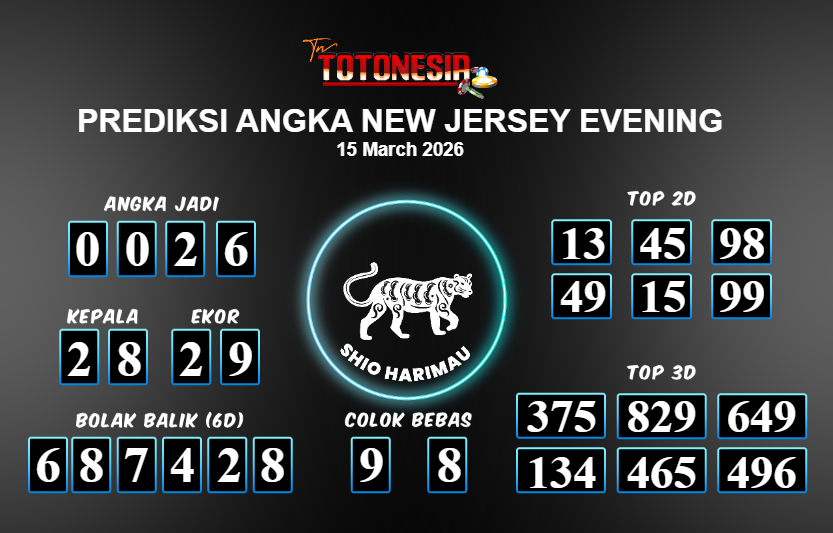 Prediksi NEW JERSEY EVENING adalah perhitungan nomor togel unggulan dari agen suhu togel yang menyajikan angka prediksi paling akurat, sehingga memberikan banyak keuntungan saat bermain di pasar togel NEW JERSEY EVENING . TotoNesia adalah prediksi dengan rasio kemenangan tertinggi di Indonesia. Sebagai penyedia togel yang dapat dipercaya, kami bertekad untuk memberikan ramalan togel yang handal dengan hadiah terbesarnya. Maka dari itu, jangan sampai terlewatkan prediksi bandar togel dengan hadiah terbanyak bet 100 dari pasar togel terbaik NEW JERSEY EVENING Daftar sekarang juga di bandar.