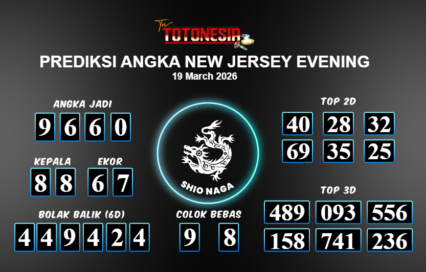 Prediksi NEW JERSEY EVENING adalah perhitungan nomor togel unggulan dari agen suhu togel yang menyajikan angka prediksi paling akurat, sehingga memberikan banyak keuntungan saat bermain di pasar togel NEW JERSEY EVENING . TotoNesia adalah prediksi dengan rasio kemenangan tertinggi di Indonesia. Sebagai penyedia togel yang dapat dipercaya, kami bertekad untuk memberikan ramalan togel yang handal dengan hadiah terbesarnya. Maka dari itu, jangan sampai terlewatkan prediksi bandar togel dengan hadiah terbanyak bet 100 dari pasar togel terbaik NEW JERSEY EVENING Daftar sekarang juga di bandar.