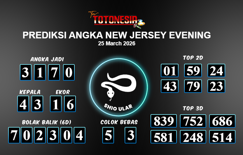 Prediksi NEW JERSEY EVENING adalah perhitungan nomor togel unggulan dari agen suhu togel yang menyajikan angka prediksi paling akurat, sehingga memberikan banyak keuntungan saat bermain di pasar togel NEW JERSEY EVENING . TotoNesia adalah prediksi dengan rasio kemenangan tertinggi di Indonesia. Sebagai penyedia togel yang dapat dipercaya, kami bertekad untuk memberikan ramalan togel yang handal dengan hadiah terbesarnya. Maka dari itu, jangan sampai terlewatkan prediksi bandar togel dengan hadiah terbanyak bet 100 dari pasar togel terbaik NEW JERSEY EVENING Daftar sekarang juga di bandar.