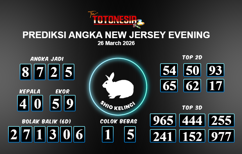 Prediksi NEW JERSEY EVENING adalah perhitungan nomor togel unggulan dari agen suhu togel yang menyajikan angka prediksi paling akurat, sehingga memberikan banyak keuntungan saat bermain di pasar togel NEW JERSEY EVENING . TotoNesia adalah prediksi dengan rasio kemenangan tertinggi di Indonesia. Sebagai penyedia togel yang dapat dipercaya, kami bertekad untuk memberikan ramalan togel yang handal dengan hadiah terbesarnya. Maka dari itu, jangan sampai terlewatkan prediksi bandar togel dengan hadiah terbanyak bet 100 dari pasar togel terbaik NEW JERSEY EVENING Daftar sekarang juga di bandar.
