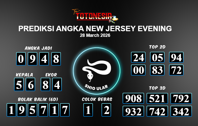 Prediksi NEW JERSEY EVENING adalah perhitungan nomor togel unggulan dari agen suhu togel yang menyajikan angka prediksi paling akurat, sehingga memberikan banyak keuntungan saat bermain di pasar togel NEW JERSEY EVENING . TotoNesia adalah prediksi dengan rasio kemenangan tertinggi di Indonesia. Sebagai penyedia togel yang dapat dipercaya, kami bertekad untuk memberikan ramalan togel yang handal dengan hadiah terbesarnya. Maka dari itu, jangan sampai terlewatkan prediksi bandar togel dengan hadiah terbanyak bet 100 dari pasar togel terbaik NEW JERSEY EVENING Daftar sekarang juga di bandar.