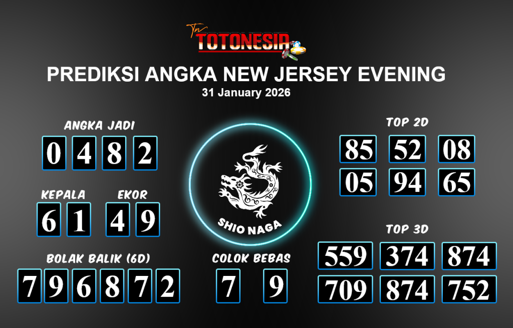 Prediksi NEW JERSEY EVENING adalah perhitungan nomor togel unggulan dari agen suhu togel yang menyajikan angka prediksi paling akurat, sehingga memberikan banyak keuntungan saat bermain di pasar togel NEW JERSEY EVENING. TotoNesia adalah prediksi dengan rasio kemenangan tertinggi di Indonesia. Sebagai penyedia togel yang dapat dipercaya, kami bertekad untuk memberikan ramalan togel yang handal dengan hadiah terbesarnya. Maka dari itu, jangan sampai terlewatkan prediksi bandar togel dengan hadiah terbanyak bet 100 dari pasar togel terbaik NEW JERSEY EVENING Daftar sekarang juga di bandar.