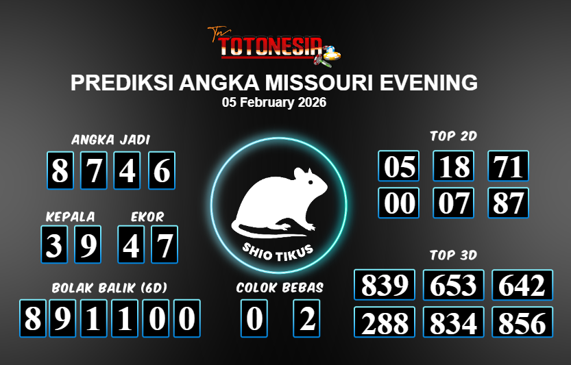 Toto Nesia : Bocoran Prediksi Togel NEW MISSOURI EVENING Tanggal 05 FEBUARI 2026