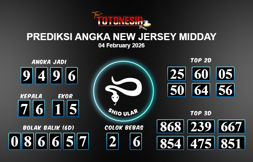 Toto Nesia : Bocoran Prediksi Togel NEW NEW JERSEY MIDDAY Tanggal 04 FEBUARI 2026