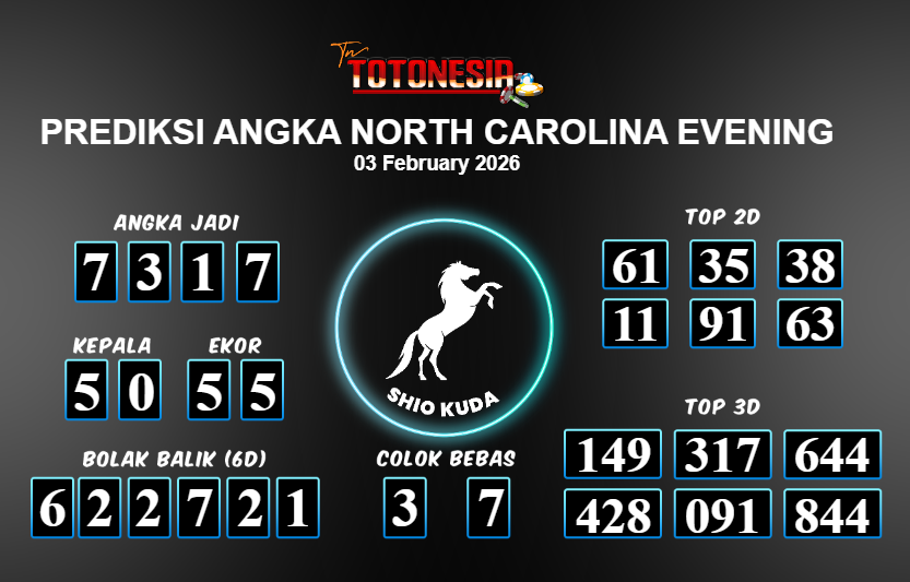 Toto Nesia : Bocoran Prediksi Togel NEW NORTH CAROLINA EVENING Tanggal 03 FEBUARI 2026