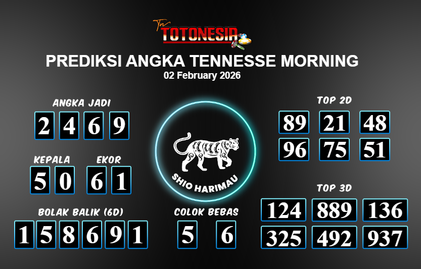 Prediksi TENNESSE MORNING adalah perhitungan nomor togel unggulan dari agen suhu togel yang menyajikan angka prediksi paling akurat, sehingga memberikan banyak keuntungan saat bermain di pasar togel TENNESSE MORNING . TotoNesia adalah prediksi dengan rasio kemenangan tertinggi di Indonesia. Sebagai penyedia togel yang dapat dipercaya, kami bertekad untuk memberikan ramalan togel yang handal dengan hadiah terbesarnya. Maka dari itu, jangan sampai terlewatkan prediksi bandar togel dengan hadiah terbanyak bet 100 dari pasar togel terbaik TENNESSE MORNING Daftar sekarang juga di bandar.