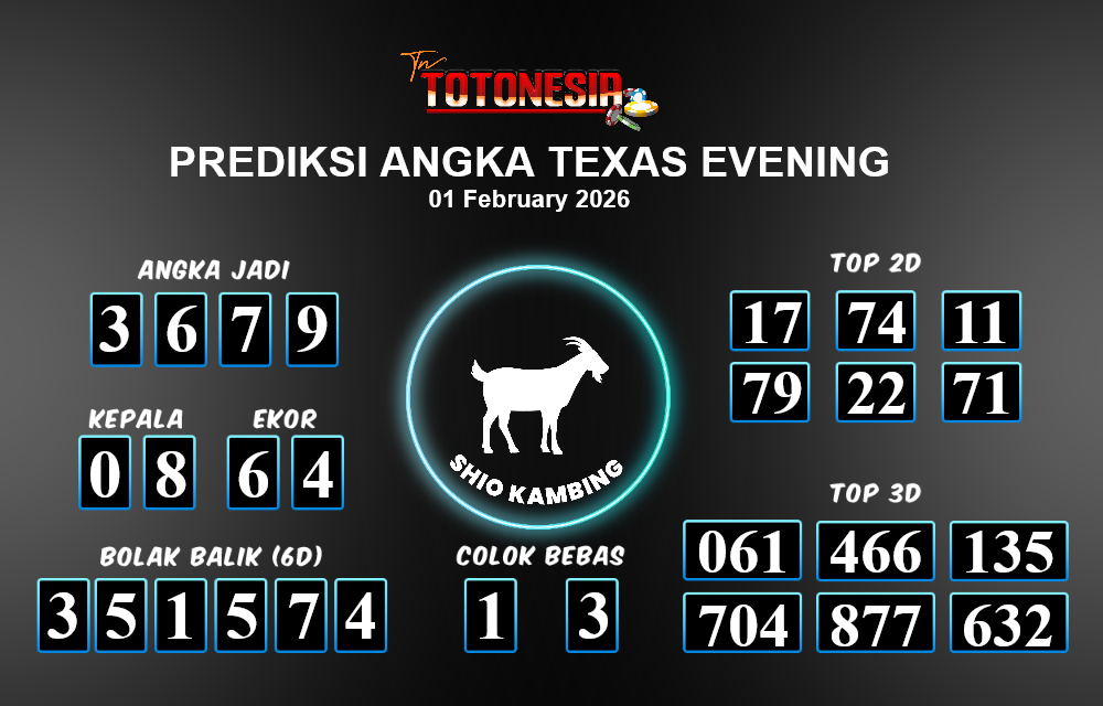Prediksi TEXAS EVENING adalah perhitungan nomor togel unggulan dari agen suhu togel yang menyajikan angka prediksi paling akurat, sehingga memberikan banyak keuntungan saat bermain di pasar togel TEXAS EVENING . TotoNesia adalah prediksi dengan rasio kemenangan tertinggi di Indonesia. Sebagai penyedia togel yang dapat dipercaya, kami bertekad untuk memberikan ramalan togel yang handal dengan hadiah terbesarnya. Maka dari itu, jangan sampai terlewatkan prediksi bandar togel dengan hadiah terbanyak bet 100 dari pasar togel terbaik TEXAS EVENING Daftar sekarang juga di bandar.