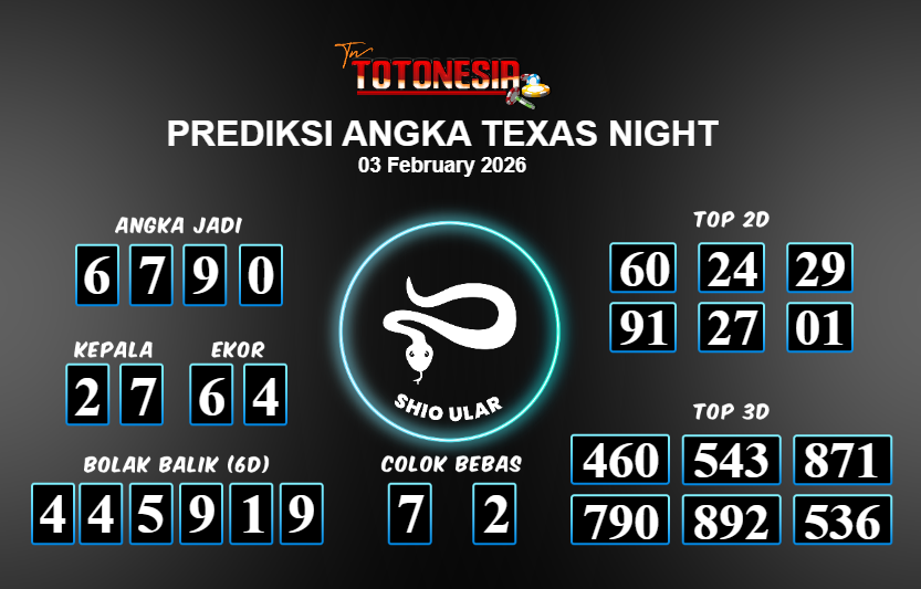 Toto Nesia : Bocoran Prediksi Togel NEW TEXAS NIGHT Tanggal 03 FEBUARI 2026